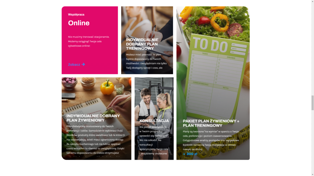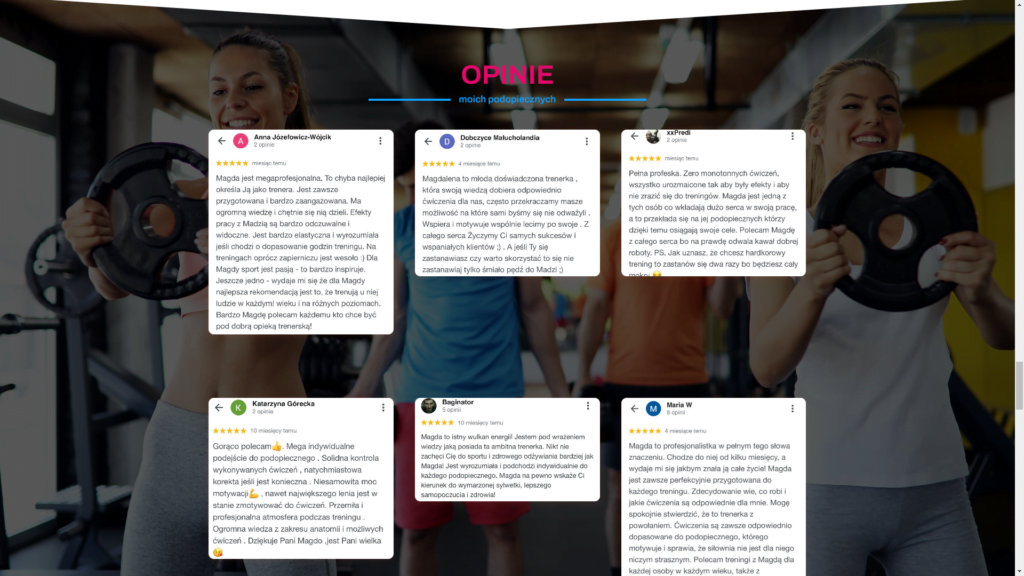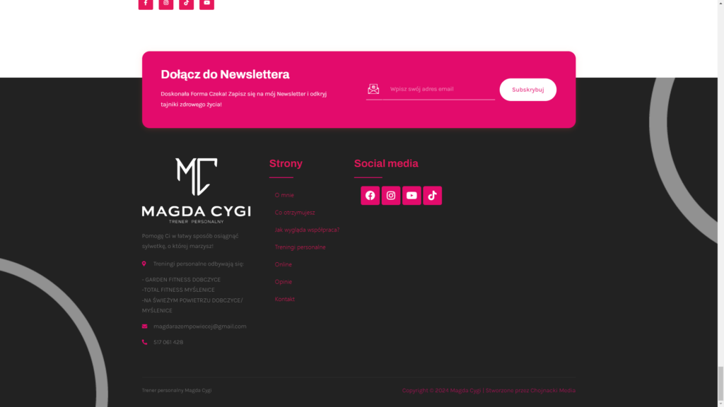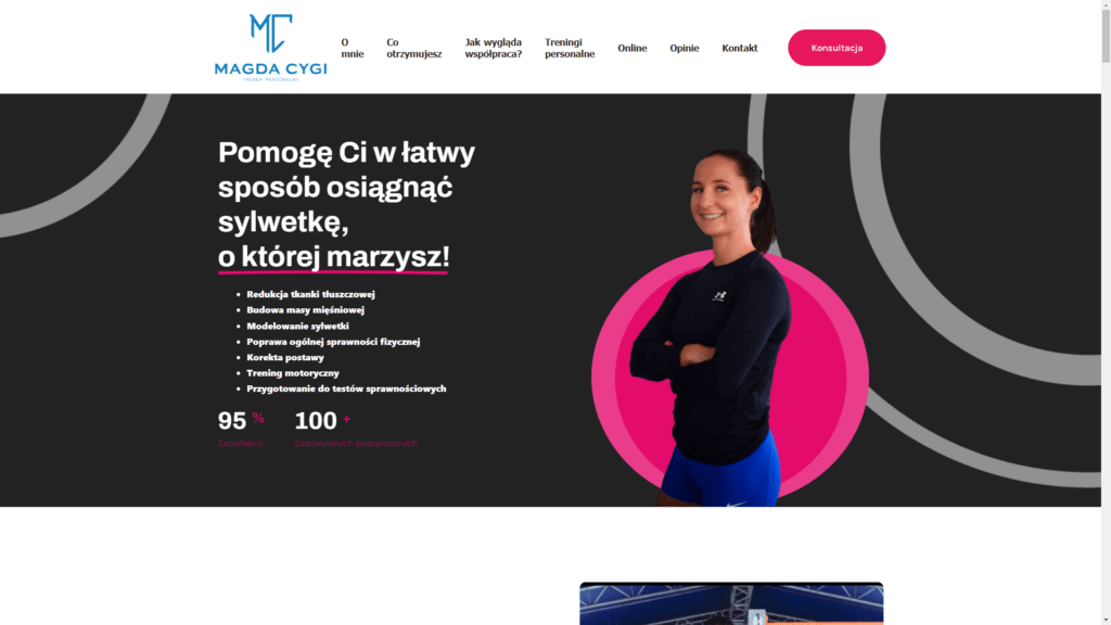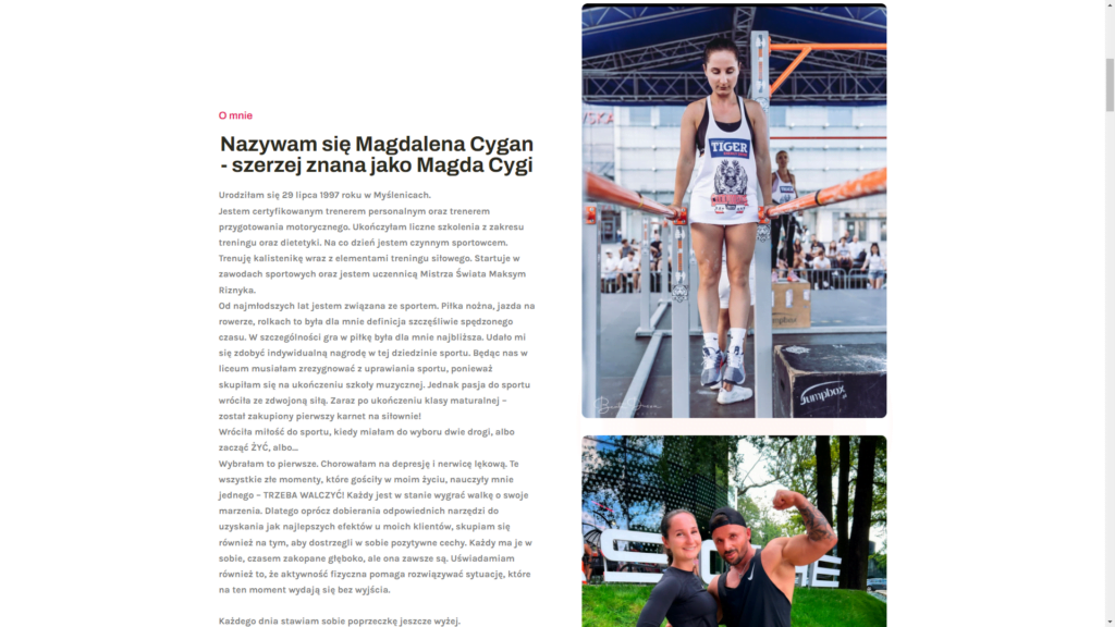 Dla Magdaleny Cygan, profesjonalnego trenera personalnego, stworzyliśmy stronę internetową, która jest odzwierciedleniem jej pasji i profesjonalizmu w dziedzinie fitness i zdrowego stylu życia. Projekt ten miał na celu nie tylko przedstawienie oferty treningowej, ale również zbudowanie platformy motywującej użytkowników do zmiany swojego życia na lepsze.