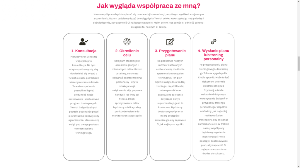 Ta sekcja wyjaśnia proces współpracy krok po kroku, od konsultacji po realizację indywidualnie dostosowanego planu treningowego. Transparentność procesu współpracy jest kluczowa dla budowania zaufania i zrozumienia między trenerem a klientem.
