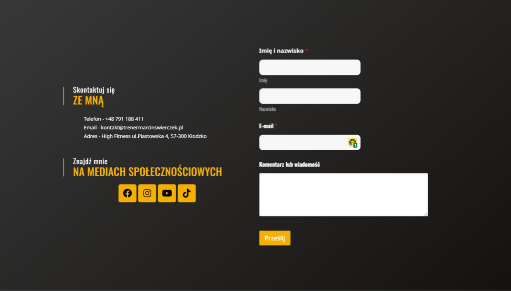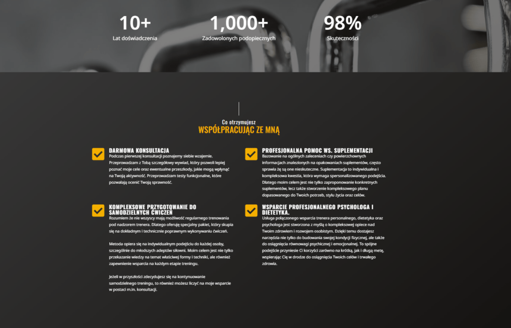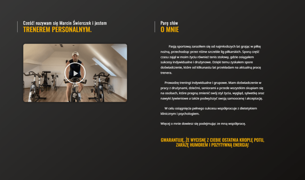 Ta sekcja zapewnia osobisty wgląd w życie i kwalifikacje Marcina, budując zaufanie i pokazując go jako eksperta w dziedzinie fitness. Opowiadając swoją historię, Marcin inspiruje i motywuje, pokazując, że zrozumienie potrzeb klienta jest kluczowe w jego metodzie pracy.